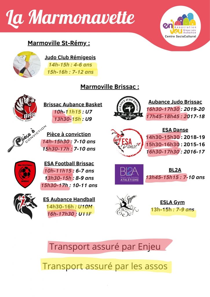 ![]() | Attention l’enfant doit aussi être inscrit à Marmoville pour pouvoir utiliser la navette. Inscriptions à la Marmonavette via l’Espace Familles Enjeu. |