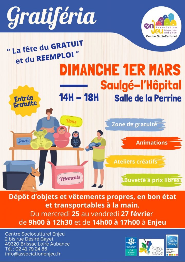Pour la 7ème édition, le dimanche 1er mars de 14h à 18h, le collectif d’habitants organisateur de la Gratiféria vous réserve une journée riche d’échanges et de partage autour du thème du réemploi à la salle de la Perrine à Saulgé l’Hôpital. Vous retrouverez des initiatives locales, des animations pour toute la famille, le fameux vélo à smoothies, la buvette tenue par les jeunes, et bien sûr la zone de gratuité pour venir chiner l’objet qui trouvera une 2ème vie chez vous.