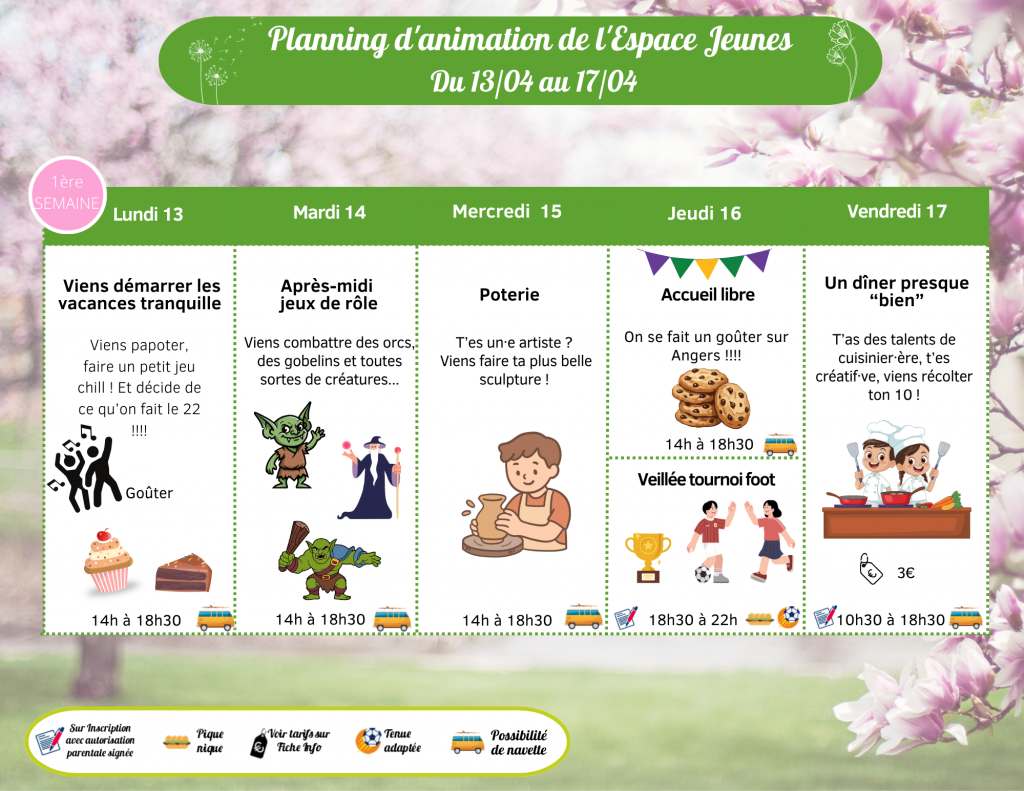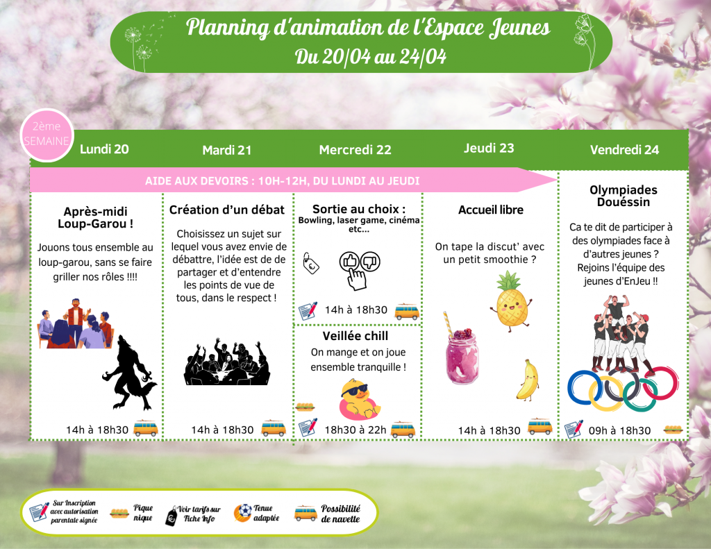 Découvrez le programme ci-dessous des vacances de printemps, du 13 au 24 avril, concocté par l’équipe Jeunesse !