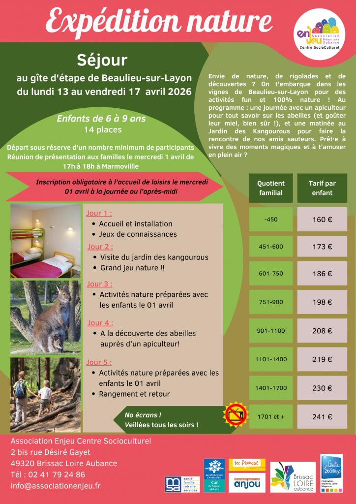 Pour les vacances de printemps, un séjour est proposé aux enfants de 6 à 9 ans, sur Beaulieu sur Layon, du 13 au 17 avril 2026.